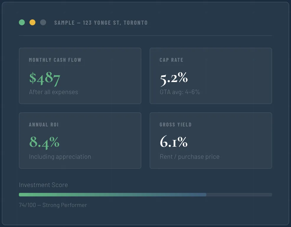 Analyze any Toronto rental property in Min, cash flow, Cap Rate, ROI and a full investor